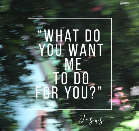 For blind Bartimaeus it seemed like an obvious one. But ask me what I want to ask for and I’m left a little stumped. But what I love about this question, is the permission it seems to offer us. That it’s ok for us to even have desires. That it’s a human thing to have longings. The question cuts away the surface level stuff and does a deep dive to get to the core of our soul. It affirms to us that it’s ok to desire