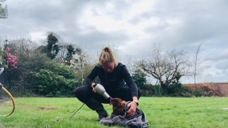 Secondly, vocationally I am a counsellor. I love my job. I love it because I know that one of my hearts deepest longings is to connect on more than a superficial level with people and for all of life to be well. Whether this is a client, friends, my family, my dog, the rescued hens that live in my garden. I long for all of them to be well. I’ve just come in from the garden this afternoon where I was bathing a hen that’s not been doing too well lately. She kept on falling over and her feathers had become muddy from the wet ground. I bathed her and then blew dry her feathers. One of my core desires is for all of life to be well. Here’s a little snapshot from bath time…